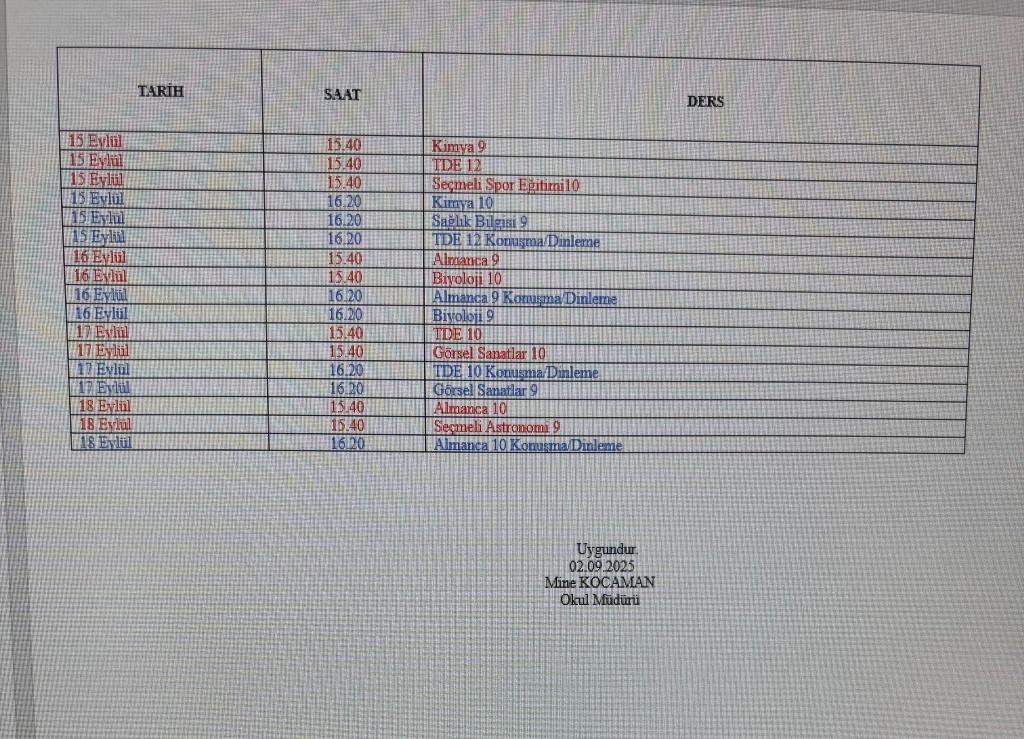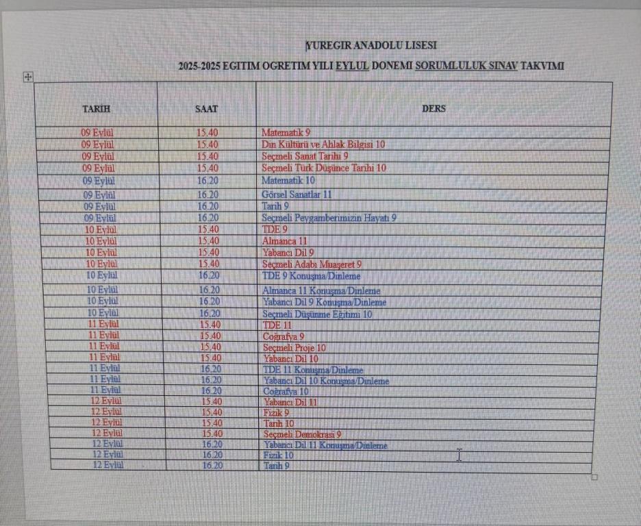 EYLÜL DÖNEMİ SORUMLULUK SINAV TAKVİMİ